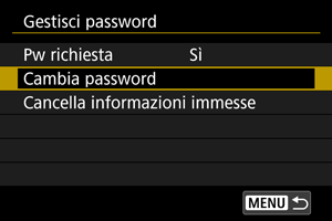 È possibile modificare la password da immettere dopo che l'interruttore di accensione viene impostato su Accensione o la fotocamera riprende il funzionamento dallo spegnimento automatico.