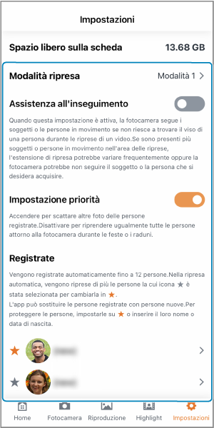 È possibile impostare la modalità di ripresa () e attivare/disattivare l'assistenza all'inseguimento durante la registrazione di filmati () e la priorità di ripresa di determinate persone ().