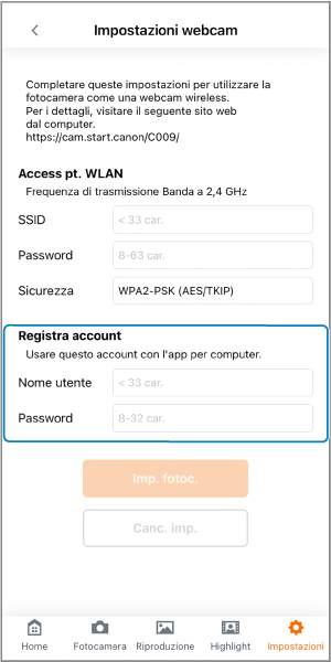 - Registrare il punto di accesso LAN wireless e l'account della webcam nella fotocamera.