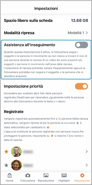 - Non tutte le persone possono essere inseguite se sono presenti poche persone in movimento. Prima della registrazione, determinare la persona che si preferisce riprendere.