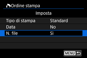 - Anche se [Data] e [N. file] sono impostati su [Sì], è possibile che, con alcune impostazioni del tipo di stampa e su alcune stampanti, queste informazioni non vengano stampate.