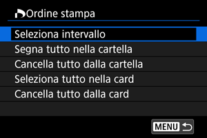 Selezionare [Segna tutto nella cartella] e selezionare la cartella. Viene avviato un ordine di stampa per una copia di tutte le immagini presenti nella cartella.
