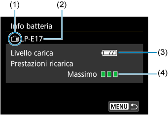 - Si consiglia l'utilizzo di una batteria Canon LP-E17 originale. Se si utilizzano batterie non originali Canon, la fotocamera potrebbe non raggiungere prestazioni ottimali e non funzionare correttamente.
