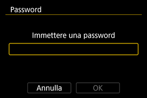 Utilizzare queste impostazioni per gestire la password immessa quando l'interruttore di accensione è impostato su o la fotocamera riprende il funzionamento dallo spegnimento automatico. Per istruzioni su come impostare la password richiesta all’avvio della fotocamera, vedere Impostare una password.