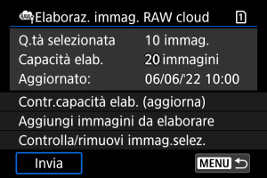 - [Capacità elab.] è [0] se non si ha un abbonamento a pagamento per l'elaborazione di immagini RAW sul cloud. Se si controlla la capacità di elaborazione senza avere un abbonamento, si riceveranno informazioni sull'abbonamento all'indirizzo e-mail registrato su image.canon.