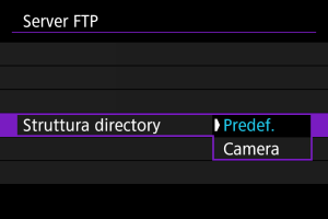 Crea automaticamente una struttura di cartelle corrispondente a quella della fotocamera (come A/DCIM/100EOSR6) nella cartella principale del server per la memorizzazione delle immagini. Se nella cartella principale è stata creata una sottocartella modificando l'impostazione [Cartella destinazione], viene automaticamente creata una struttura di cartelle come A/DCIM/100EOSR6 in tale cartella per la memorizzazione delle immagini.