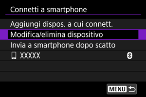 Prima di modificare o eliminare le impostazioni di connessione per altri dispositivi, terminare la connessione Wi-Fi. Qui, [