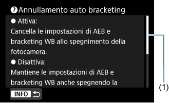 . Premere nuovamente il pulsante per uscire dalla visualizzazione della Guida. Per scorrere la schermata quando una barra di scorrimento (1) viene visualizzata sulla destra, ruotare la ghiera