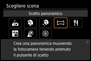 Utilizzare la modalità [] (Scatto panoramico) per scattare foto di panorami. Il panorama viene creato unendo gli scatti acquisiti durante lo scatto continuo mentre si sposta la videocamera in una direzione e si preme completamente il pulsante di scatto.