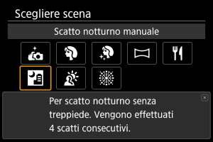 La modalità [] (Scatto notturno manuale) consente di scattare scene notturne manualmente. In questa modalità di scatto, vengono eseguiti quattro scatti consecutivi per ogni foto e verrà registrata l'immagine in cui le vibrazioni della videocamera sono meno evidenti.