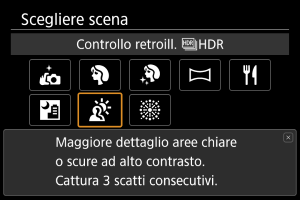 HDR) per scene retroilluminate con aree luminose e scure. In questa modalità, vengono acquisite tre immagini consecutive con esposizioni diverse, che vengono unite per creare una singola immagine HDR che mantiene i dettagli delle zone in ombra, che andrebbero altrimenti persi a causa della retroilluminazione.