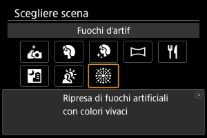 Utilizzare la modalità [] (Fuochi d'artif) per scattare foto di fuochi d'artificio con colori vivaci.