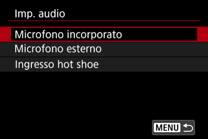 Configurare i microfoni usati durante la registrazione di filmati. Quando si usano microfoni esterni, assicurarsi di fare riferimento al manuale di istruzioni del microfono.