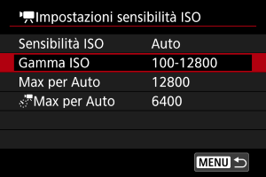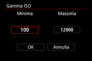 È possibile impostare l'intervallo per l'impostazione manuale della sensibilità ISO (Minima/Massima).