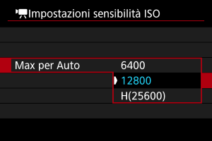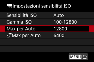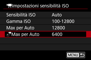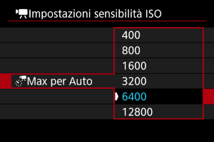 ] con ISO Auto. Per impostazione predefinita, il limite massimo è impostato su ISO 6400. Il limite massimo può essere impostato in un intervallo di ISO 400-12800.