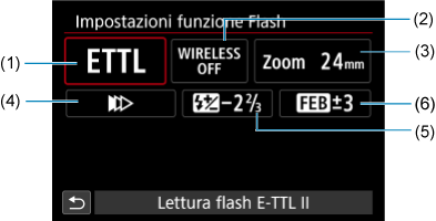 Le informazioni visualizzate sullo schermo, la posizione del display e le opzioni disponibili variano a seconda del modello di Speedlite, delle impostazioni delle funzioni personalizzate, della modalità flash e di altri fattori. Per ulteriori informazioni sulle funzioni dello Speedlite, consultare il Manuale di istruzioni dello Speedlite.