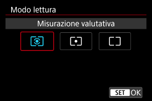 Sono disponibili metodi per misurare la luminosità del soggetto (modalità di misurazione). Generalmente, si consiglia la misurazione valutativa. Questa modalità viene impostata automaticamente nelle modalità della zona base (tranne che nella modalità :