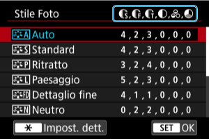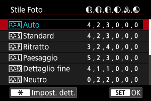 Le icone nella schermata di selezione dello Stile Foto rappresentano [Intensità], [Precisione] e [Soglia] per [Nitidezza] così come [Contrasto] e altri parametri. I numeri indicano i valori per questi parametri per il rispettivo Stile foto.