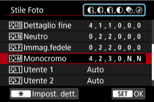 È possibile personalizzare qualsiasi Stile foto cambiando le impostazioni predefinite. Per i dettagli sulla personalizzazione [Monocromo], vedere Regolazione del bianco e nero.