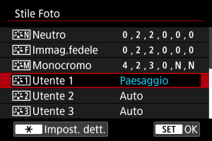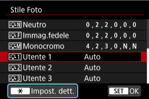- Se in [Utente *] è già stato registrato uno Stile Foto, la modifica dello Stile Foto di base elimina le impostazioni dei parametri dello Stile Foto definito dall'utente registrato.