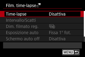- Per annullare la registrazione di filmati time-lapse, impostare [Time-lapse] su [Disattiva].