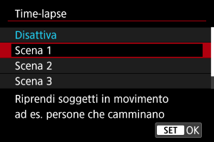 Le seguenti operazioni annullano la modalità standby per la registrazione di filmati time-lapse e configurano l'impostazione su [Disattiva].
