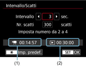 Indica il tempo richiesto per scattare il numero di foto nell'intervallo impostato. Se supera 24 ore, verrà visualizzato "*** giorni".