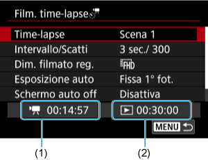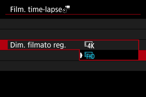 Indica la durata di registrazione del filmato (tempo necessario per riprodurre il filmato) per creare il filmato time-lapse in 4K o Full HD dalle foto scattate negli intervalli predeterminati.