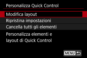 - Selezionare [Cancella tutti gli elementi] per rimuovere tutti gli elementi dal layout in modo che non venga visualizzata alcuna schermata Quick Control quando si preme
