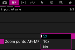 : Zoom punto AF+MF], lo schermo viene ingrandito di 5x o 10x quando si regola la messa a fuoco.
