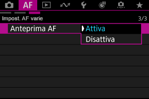 - Sono disponibili meno scatti se impostato su [Attiva], poiché AF viene azionato ininterrottamente e la carica della batteria si esaurisce.