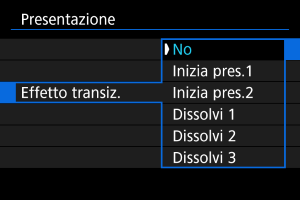 - Per le foto, configurare le impostazioni [Tempo visione], [Ripetizione] (riproduzione ripetuta) e [Effetto transiz.] (effetto applicato quando si cambia immagine).
