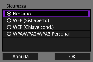 - È necessario impostare lo stesso tipo di protezione sull'altro dispositivo e sulla videocamera. Vedere Metodi di autenticazione e crittografia dei dati per maggiori informazioni sui tipi di autenticazione e criptazione.