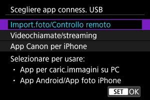 Dopo aver selezionato [Videochiamate/streaming], utilizzare il cavo di interfaccia per collegarsi al computer, quindi avviare l'applicazione.