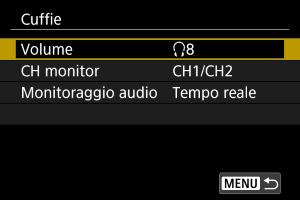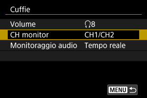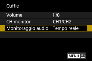 È possibile scegliere l'audio durante la registrazione di filmati utilizzato per l'uscita dalle cuffie. Per ridurre il disturbo durante le registrazione di audio, configurare [Riduz.distur.audio] ().