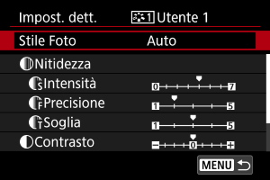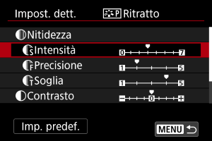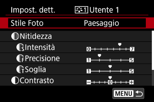 - Non è possibile impostare [Precisione] e [Soglia] per [Nitidezza] per la registrazione di filmati (non visualizzati).