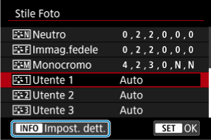 - Se in [Utente *] è già stato registrato uno Stile Foto, la modifica dello Stile Foto di base elimina le impostazioni dei parametri dello Stile Foto definito dall'utente registrato.