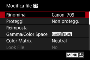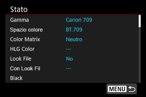 - Non è possibile usare un file look registrato se si cambiano le impostazioni [Gamma/Color Space], [HLG Color] o [Over 100%] dopo la registrazione.