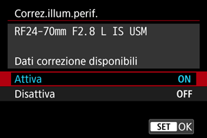 - Verificare che siano visualizzati il nome dell'obiettivo montato e [Dati correzione disponibili].