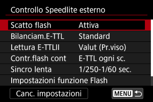 Le funzioni degli Speedlite serie EL/EX compatibili con le impostazioni della funzione flash possono essere impostate tramite la schermata dei menu della fotocamera. Montare lo Speedlite sulla fotocamera e accenderlo prima di impostare le funzioni del flash.