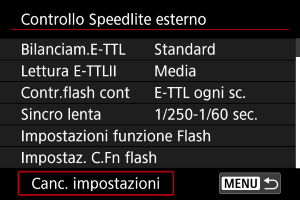 - Selezionare [Cancella impostazioni flash] o [Canc. tutti C.Fn Speedlite].