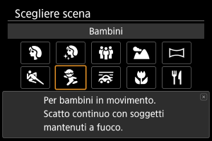 Utilizzare la modalità [] (Bambini) per scattare foto di bambini in movimento. Le tonalità della pelle risultano più accese.