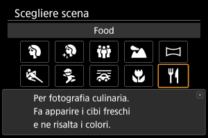 Usare [] (Food) per la fotografia culinaria. La foto apparirà luminosa e stuzzicante. Riduce anche la tonalità rossastra dovuta a luci al tungsteno o sorgenti di luce simili.
