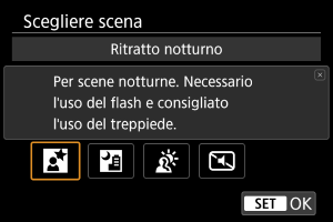Usare [] (Ritratto notturno) per effettuare ritratti di persone luminosi con scene notturne di sfondo. Lo scatto in questa modalità richiede un'unità flash esterna. Si consiglia di utilizzare un treppiede.