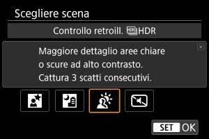 HDR) per scene retroilluminate con aree luminose e scure. In questa modalità, vengono acquisite tre immagini consecutive con esposizioni diverse, che vengono unite per creare una singola immagine HDR che mantiene i dettagli delle zone in ombra, che andrebbero altrimenti persi a causa della retroilluminazione.