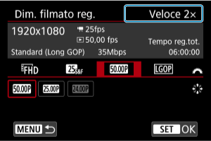 I filmati possono essere registrati per la riproduzione lenta o veloce. L'audio non viene registrato. Impostare la velocità lenta o veloce (velocità di riproduzione) in [: Dim. filmato reg.].