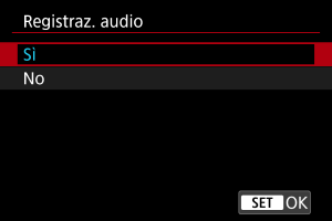 Selezionare [Sì] per registrare l'audio durante la registrazione di filmati. Per la registrazione viene utilizzato il microfono incorporato, a meno che non si utilizzino microfoni esterni o progettati per il montaggio su slitta multifunzione.