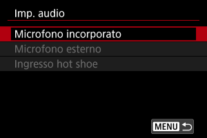Configurare i microfoni per la registrazione audio in queste impostazioni. Quando si usano microfoni esterni o progettati per il montaggio su slitta multifunzione, vedere anche il manuale di istruzioni del microfono.