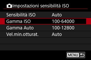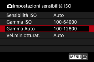 È possibile impostare la gamma della sensibilità ISO automatica per ISO Auto.