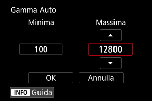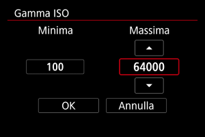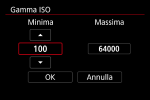 È possibile configurare l'intervallo di impostazione della sensibilità ISO manuale (limite minimo e massimo).